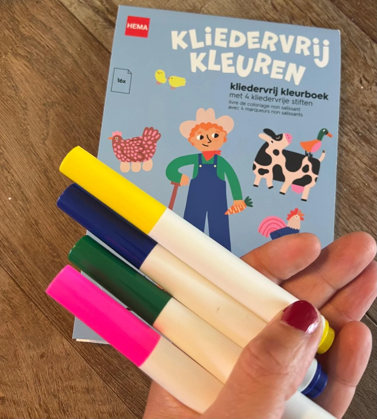 Deze stiften zijn ideaal voor onderweg: de kleur is alleen zichtbaar op het speciale papier uit het kleurboek, dus geen vlekken in de auto. Het kleurboek is te koop bij de HEMA, maar nog niet beschikbaar in de webshop.