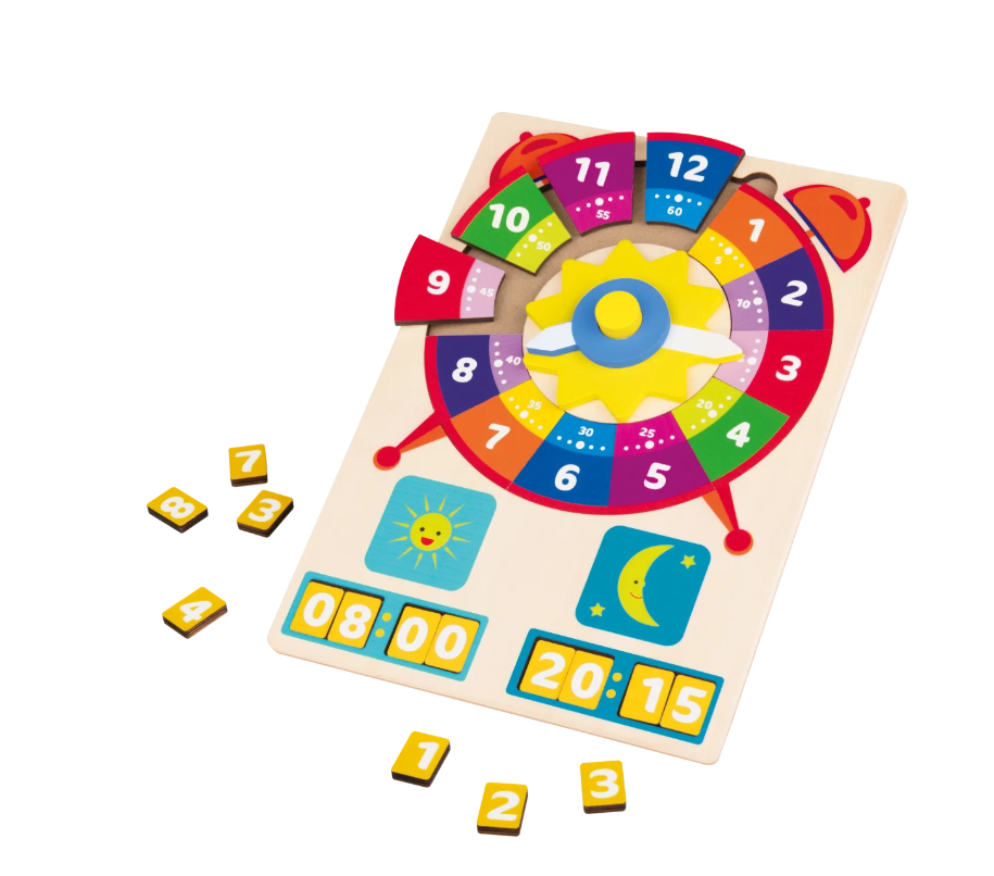 Met deze vrolijke speelklok ontdekken kinderen spelenderwijs hoe de tijd werkt. De klok heeft twee beweegbare wijzers waarmee ze zelf kunnen oefenen met uren en minuten. Dit 87-delige setje is ideaal voor kinderen vanaf 3 jaar en brengt leren en spelen op een leuke manier samen. Let op niet geschikt voor kinderen jonger dan 36 maanden vanwege kleine onderdelen die verstikkingsgevaar kunnen opleveren.